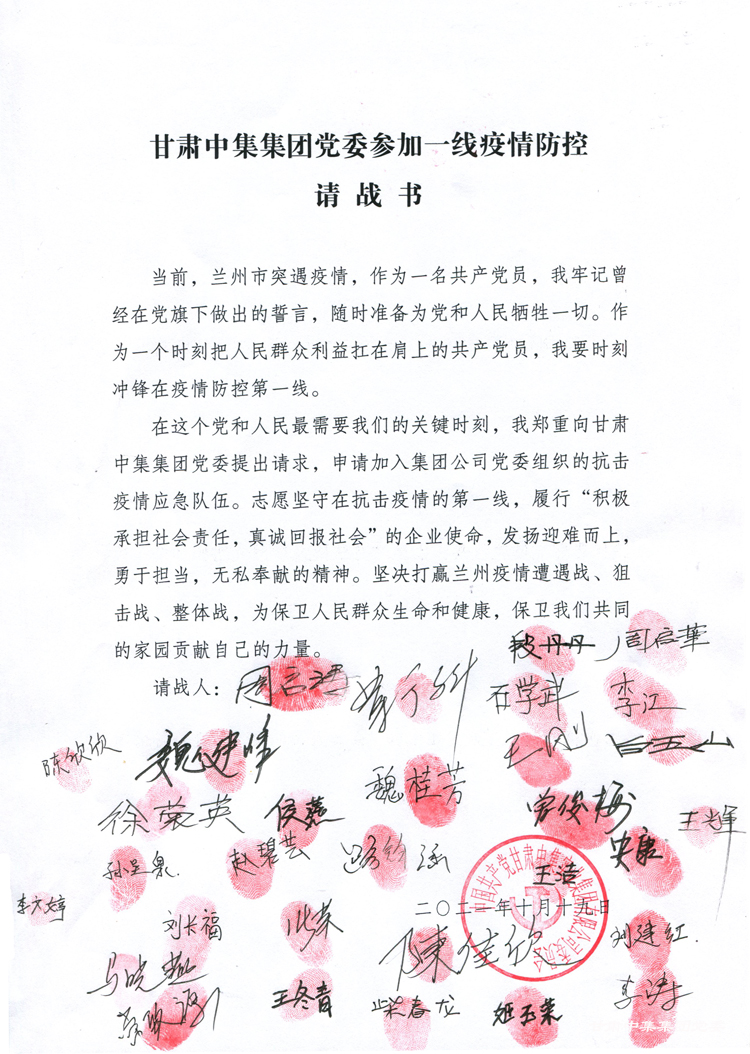 請(qǐng)黨放心,抗疫有我。甘肅中集集團(tuán)勇?lián)鐣?huì)責(zé)任,積極參與疫情防控各項(xiàng)工作,為疫情防控貢獻(xiàn)了“甘肅中集”力量、注入了“甘肅中集”暖流,充分彰顯甘肅中集集團(tuán)大愛擔(dān)當(dāng)及應(yīng)盡社會(huì)職責(zé)。